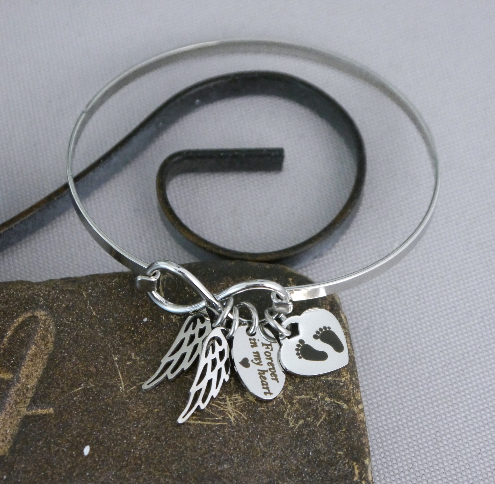 Personalized infinity bangle with two angel wing charms, "Forever in my heart" charm and heart engraved with baby feet.
