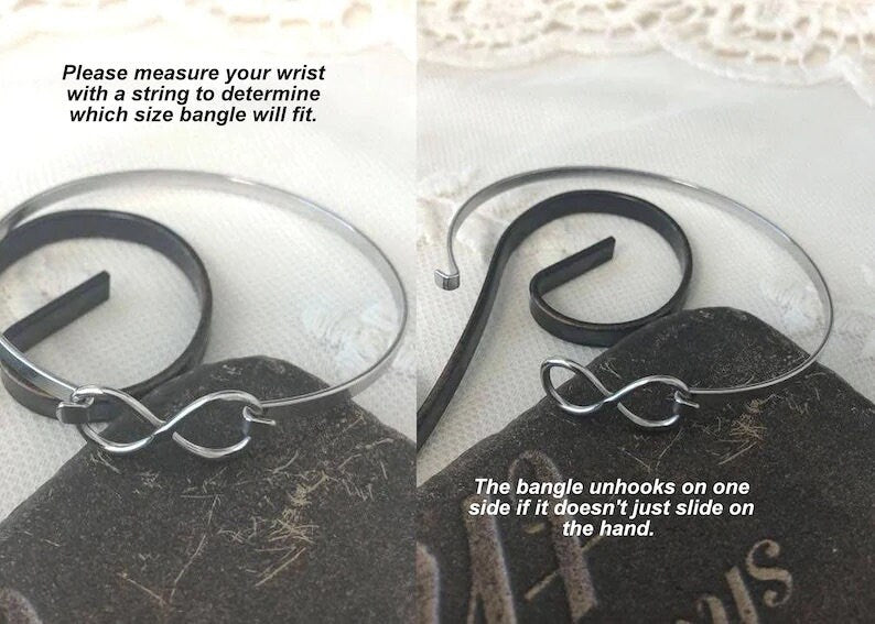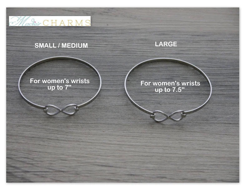 ❤ solid stainless steel adult size infinity bangle available in 2 different sizes: small/medium that is 60mm inside diameter (suitable for small to medium women’s size wrists of up to 7") and large that is 65mm inside diameter (suitable for women’s size wrists up to 7.5"). The bangle unhooks on the left side of the infinity symbol.